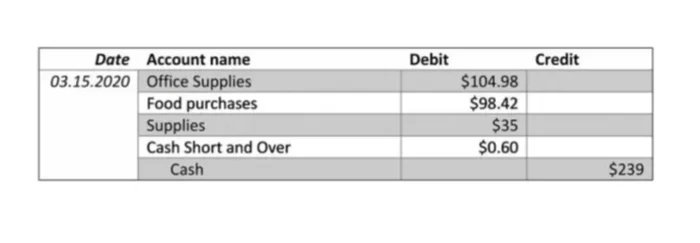 As the petty cash fund is almost depleted, the custodian begins to prepare for replenishment. All the invoices and receipts add up to $238.40. If we add $11 of remaining cash, the fund will be 60 cents short. The custodian will receive $239 to return the fund to its normal balance and create the following journal entry.